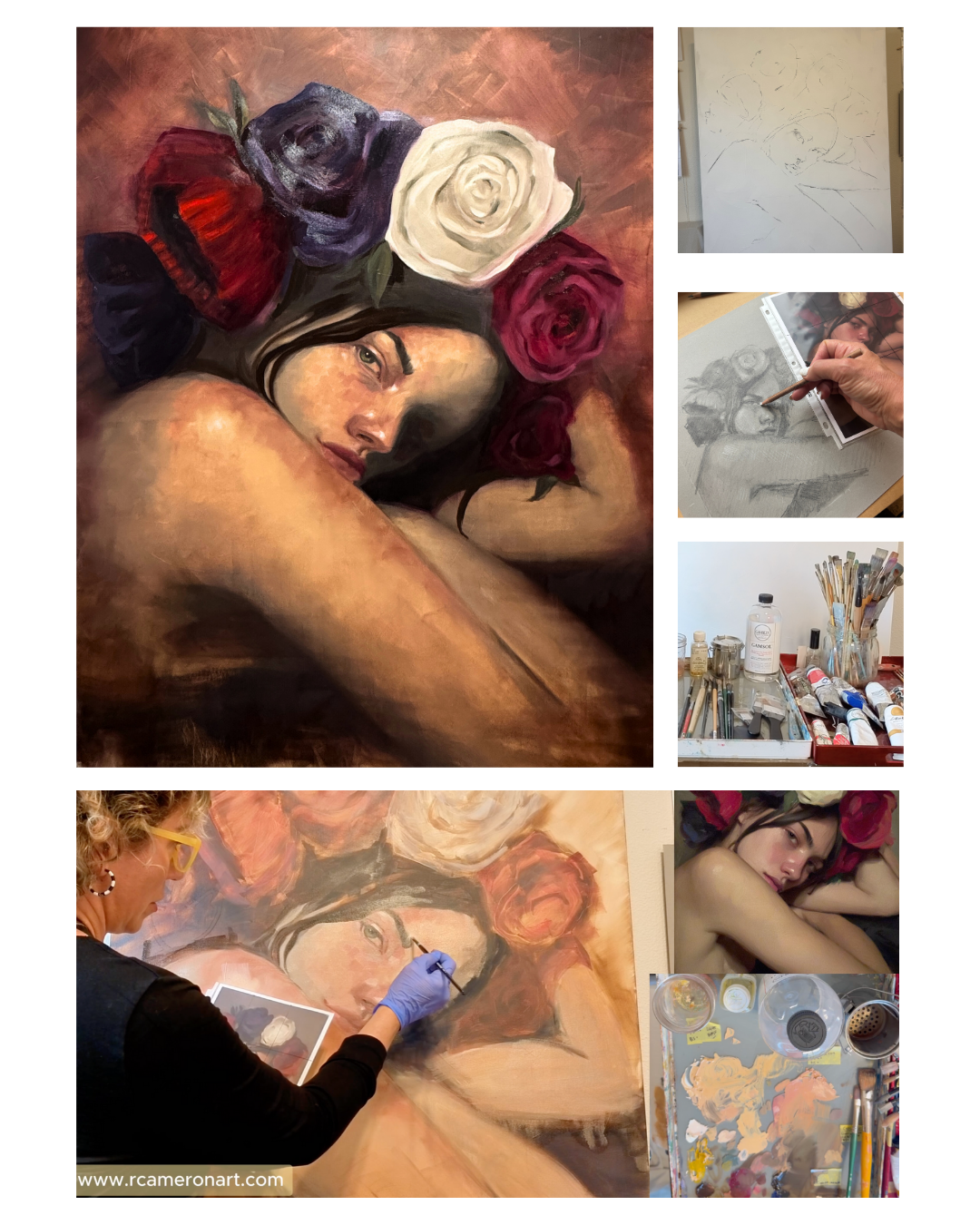 Step-by-step from sketch to underpainting, color mixing, and a finished work