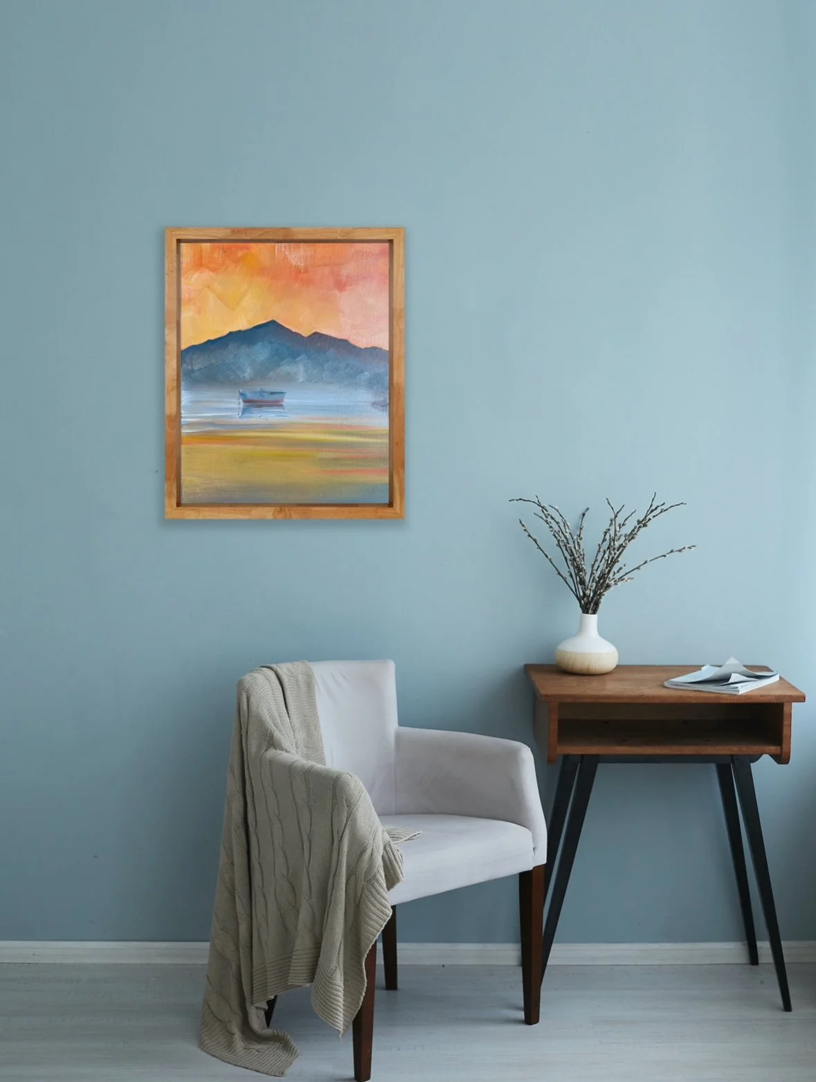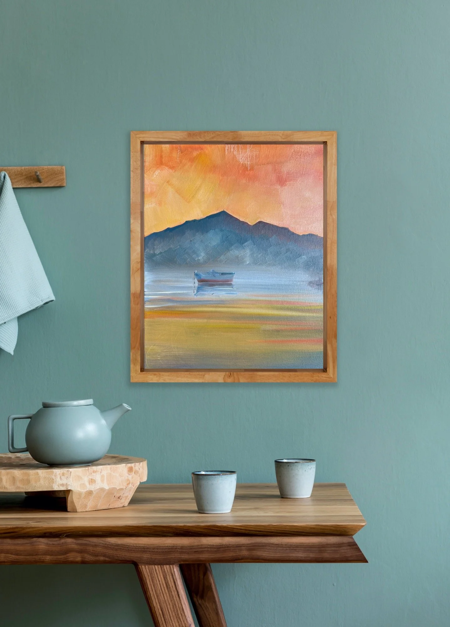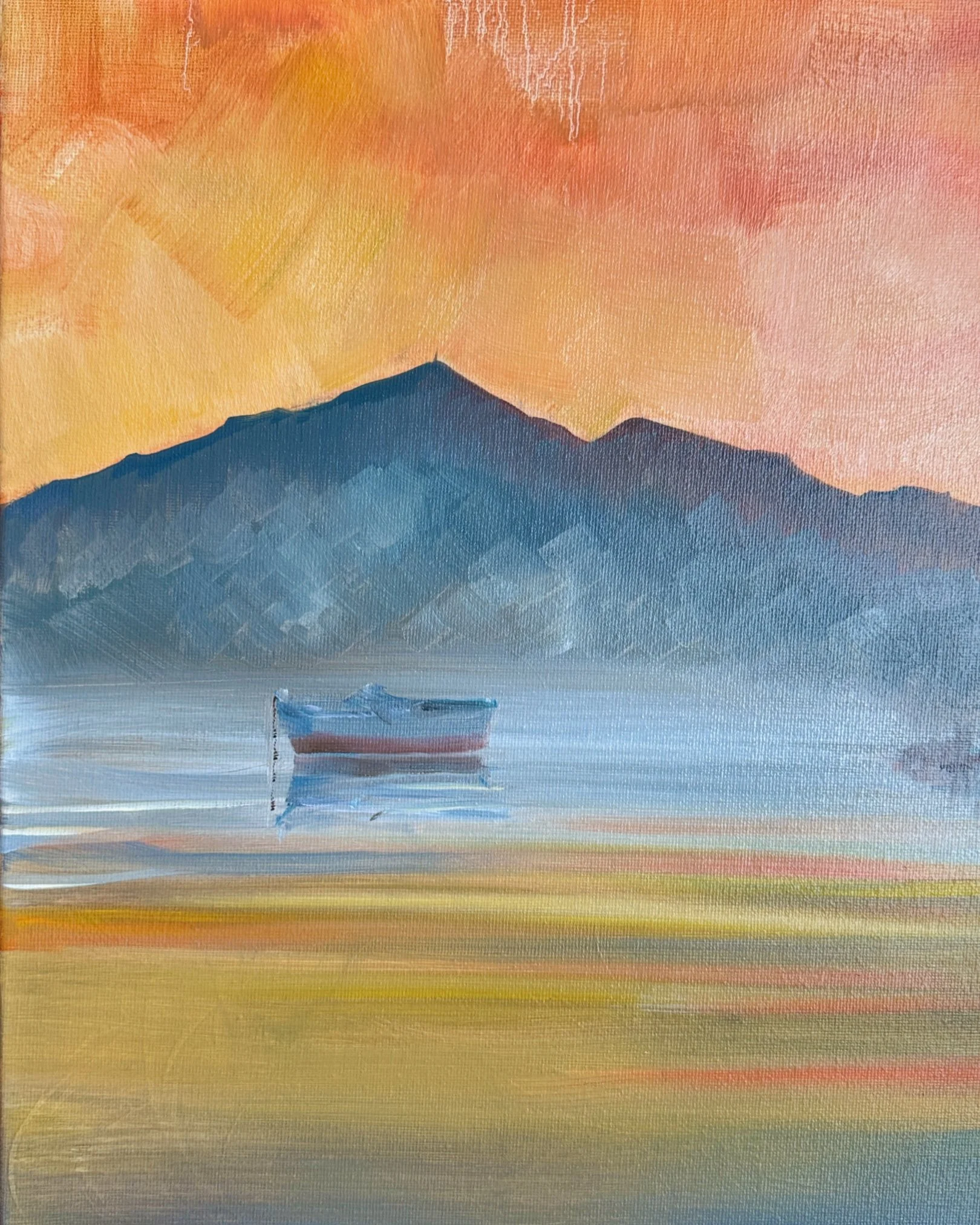A luminous sunrise spills across the water in radiant yellows, pinks, and blues. A fishing boat quietly sits atop calm water. Loose brushstrokes and textured layers create depth and movement, echoing the fleeting brilliance of the day’s final light.